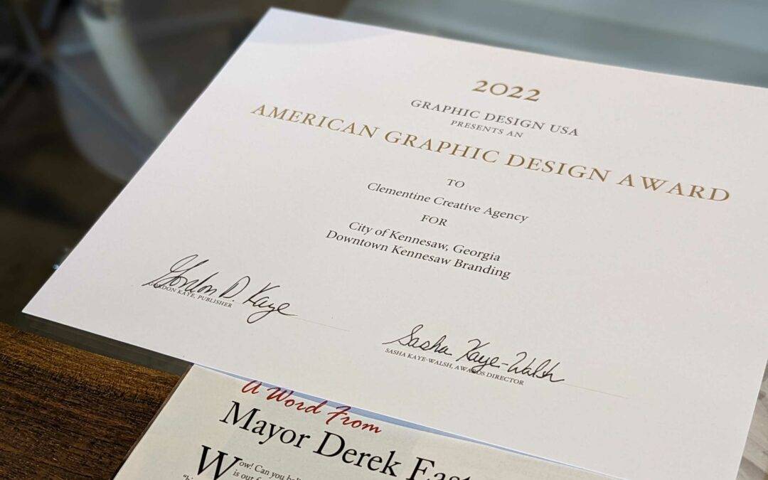 Clementine Creative Agency is ending 2022 on a high note with an American Graphic Design Award from Graphic Design USA for our Downtown Kennesaw Branding with the City of Kennesaw! Being recognized as one of the best in the creative community is an honor. We believe...